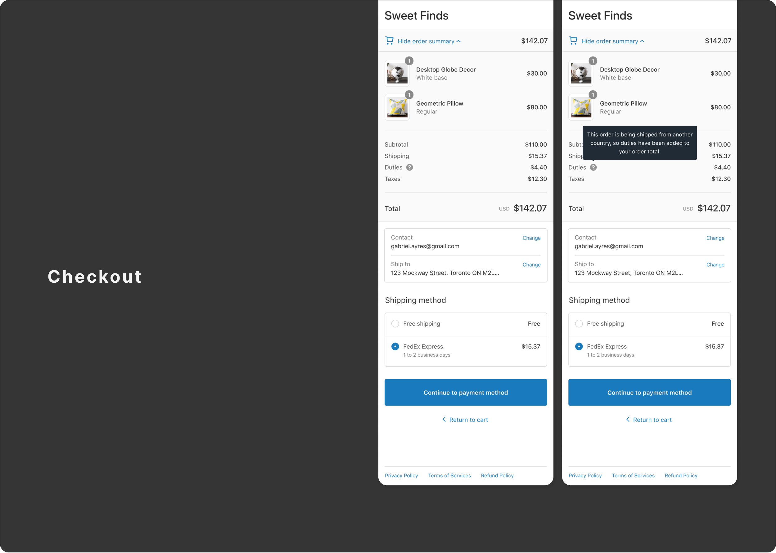 I worked with a user researcher to conduct extensive market and user research on merchants and buyers’ current experiences. This was to gain an understanding of their pain points and familiarity with duties and import taxes. Research was also important for product naming because there are so many similar industry terms (e.g. import fees, duty, duties, international taxes, cross border taxes). We wanted to make sure we were using the most familiar term that is also distinguishable from domestic taxes. I did research, iterations and usability testing for each milestone that we hit.