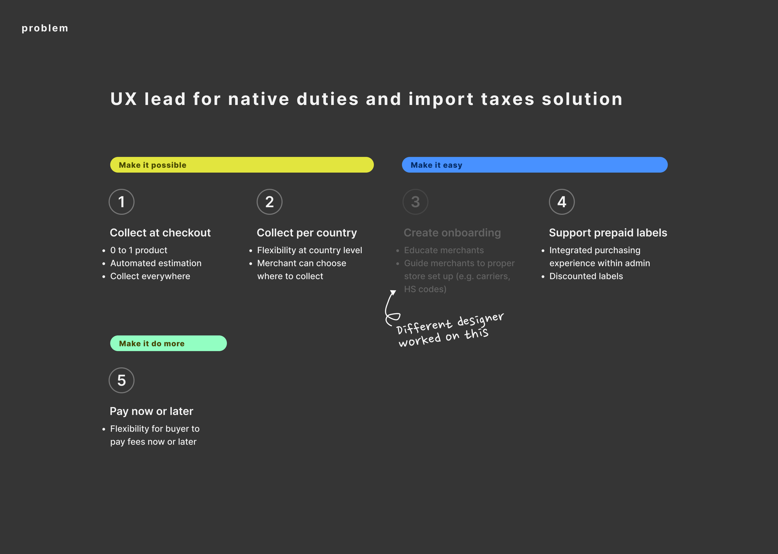 Build a 0-to-1 product that allows merchants to collect duties and import taxes at checkout and provide a premium shipping experience to their buyers. I was the lead UX designer for several milestones in this product.