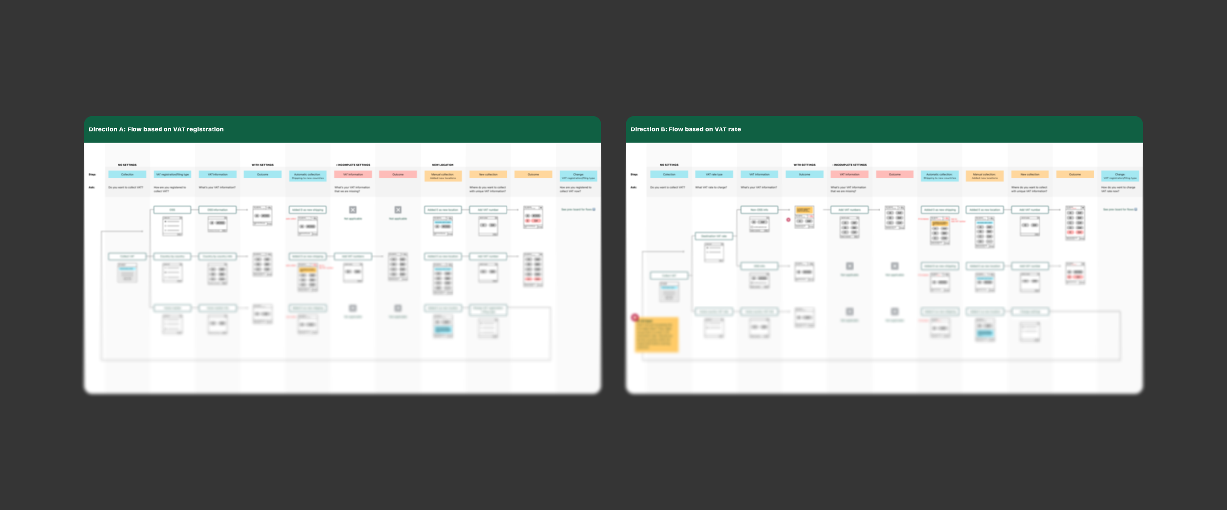Some stakeholders still strongly felt we should be positioning the language on confirming VAT rates rather than VAT registrations. Using flow charts and low-fi wireframes, I persuaded stakeholders to see why my recommended direction (e.g. VAT registrations) would be the right approach based on the downstream effects that each direction could impact workflows. With the tight timelines, I achieved early alignment before investing in high-fidelity mocks.