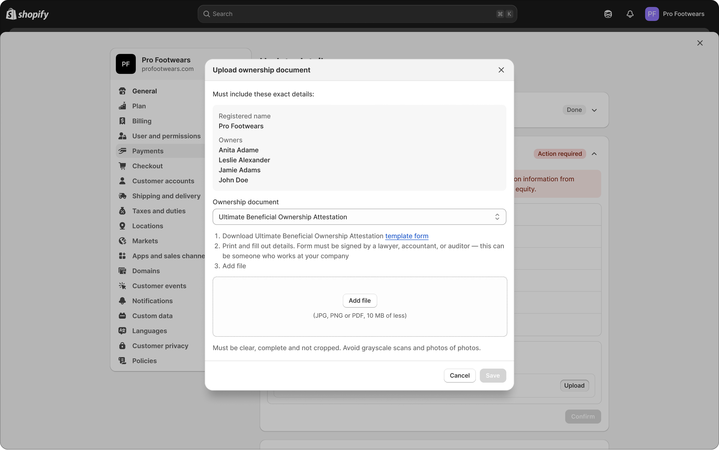 Ensure existing Shopify Payment merchants are successfully updating their business information on Shopify to meet new government regulation requirements (remediation). I was the lead UX designer for this project.